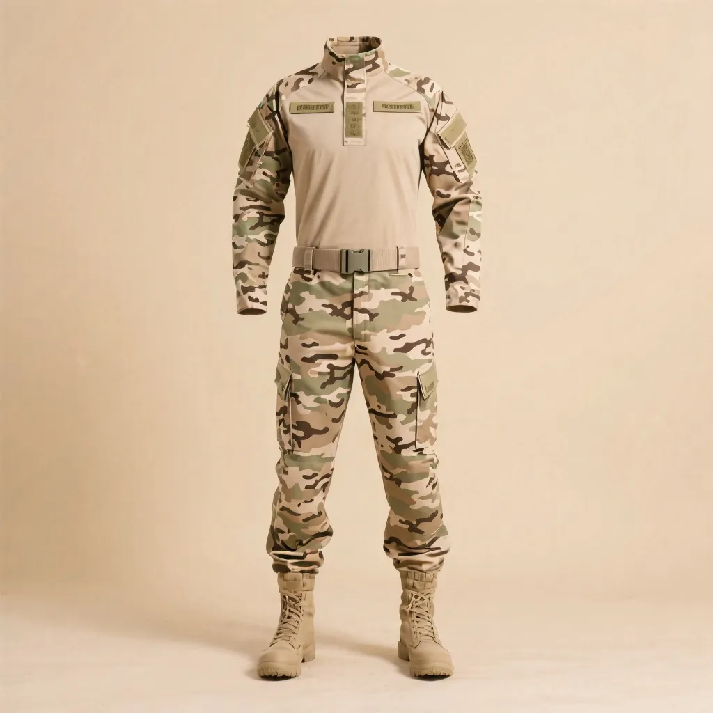 HM-01 Боевая форма с пустынной камуфляжной расцветкой: изготовлена из износостойкой, прочной ткани, обеспечивающей защиту от ветра и песка, а также обладающей дышащими и быстросохнущими свойствами. Оптимизирована для умеренного пустынного климата, имеет скрытые карманы и модульные системы крепления.